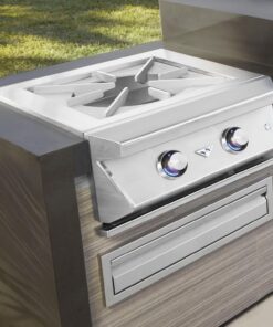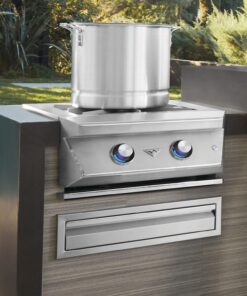 Elevate your outdoor cooking with the Twin Eagles Power Burner. Crafted in the USA from premium 304 stainless steel. this power burner ensures quality construction and durability. The independently controlled cast brass 2-ring burner boasts an impressive 70.000 BTU. providing the versatility to simmer delicate sauces or boil with maximum heat control. The Indigo Blue Exclusive Control Illumination matches Twin Eagles grills. adding both functionality and style to your outdoor kitchen. The reversible stainless steel grate is specially designed for restaurant stockpots and commercial woks. making it a versatile addition to your culinary space. With its oversized cast brass power burner. seamless front panel. and high polished accents. this power burner sets new standards in outdoor kitchen accessories. The control knobs with Exclusive Control Illumination offer a precise control setting. while the full-extension drip pan allows for easy cleanup. A matching stainless steel cover is included to protect the burner when not in use. The reliable hot surface ignition with a safety gas valve ensures quick and safe ignition. Twin Eagles products are proudly designed and manufactured in the USA.