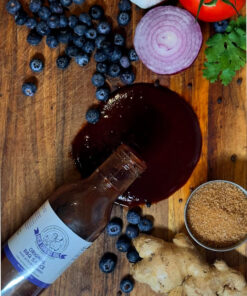 Ingredients: Ketchup (tomato concentrate water. tomato paste. sugar. vinegar. sea salt. dehydrated onion. natural flavors. garlic powder). filtered water. brown sugar. blueberry juice from concentrate (filtered water. blueberry juice concentrate). blueberries. tapioca syrup (tapioca starch. water). rice vinegar (water. rice). garlic powder. food starch-modified. ginger powder. onion powder. vanilla extract (water. alcohol. vanilla bean extractives). sea salt.