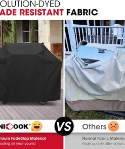 - Fade Resistant Waterproof BBQ Cover: Unicook grill cover for outdoor grill. is constructed with Heavy Duty Fade Resistant polyester with Waterproof vinyl coating. exhibits superior colorfastness. resists UV. rain. tearing and cold cracking. Use confidently with Unicook durable grill cover to protect your grill from all elements