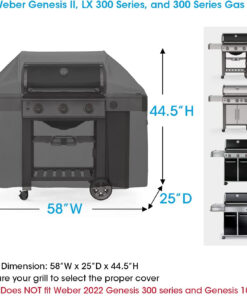 - 【58 Inch Grill Cover Dimension】Unicook gas grill cover measures 58W x 25D x 44.5H. Same dimension with Weber 7130 grill cover. designed for Weber Genesis II/EX/SX/LX 300 and Genesis 300 series grills. (Does NOT fit Weber 2022 Genesis 300 series grills.) Also work for other brands of 3 – 5 burner grills with similar size up to 56W. such as Char-Broil. Nexgrill. Monument and more. Be sure to measure your grill first to determine the proper cover.