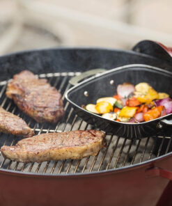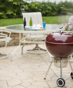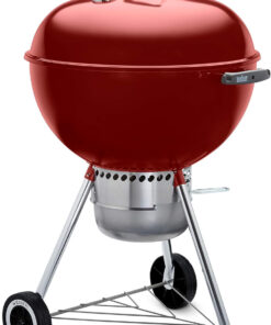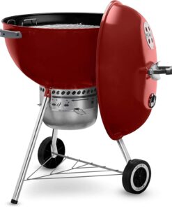 Weber. 22. crimson. original premium kettle. plated steel cooking grate provides 363 of cooking space. hinges on grate makes adding charcoal easier. porcelain enameled bowl & lid. aluminized steel 1 touch cleaning system. improved high capacity ash catcher is removable. rust resistant damper. heat shield lid handle. all weather durable wheels. built in lid thermometer. push pin leg connectors. limited 10 year warranty.