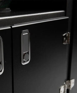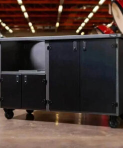 For secure storage. the cabinet features black marine-grade polyethylene doors beneath the cart. built to withstand outdoor conditions. Heavy-duty hardware. two-way locking. and 4 casters add mobility and stability. making this grill cabinet a rugged and practical addition to your outdoor kitchen.