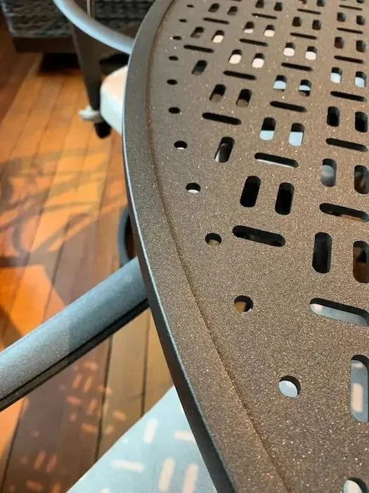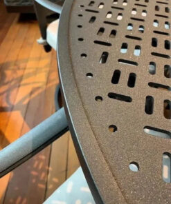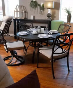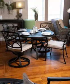 This 48 dining set from Woodard features a Lattice top table with 4 chairs from Woodard’s Wiltshire collection. Includes 2 swivel arm chairs and 2 non-swivel dining arm chairs.