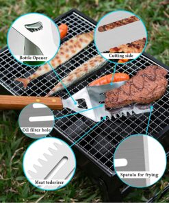 - USER-FRIENDLY DESIGN: It can be seen that some of the grilling tools has some outstanding features. For instance. a multifunctional spatula has a 2 in 1 design. one is used for cutting meat with its sharp serrated edge. the other is used as a bottle opener. There is a wood handle design of chopper in order to grip easily and comfortably.