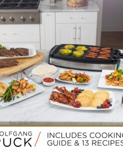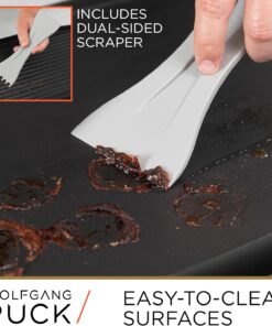 - INCLUDES: Wolfgang Puck’s XL Reversible Grill Griddle includes a helpful cooking guide with 13 unique recipes for both the grill and griddle plate. a dual-sided scraper for easy cleaning. an extra-large removable drip tray. and a temperature probe.